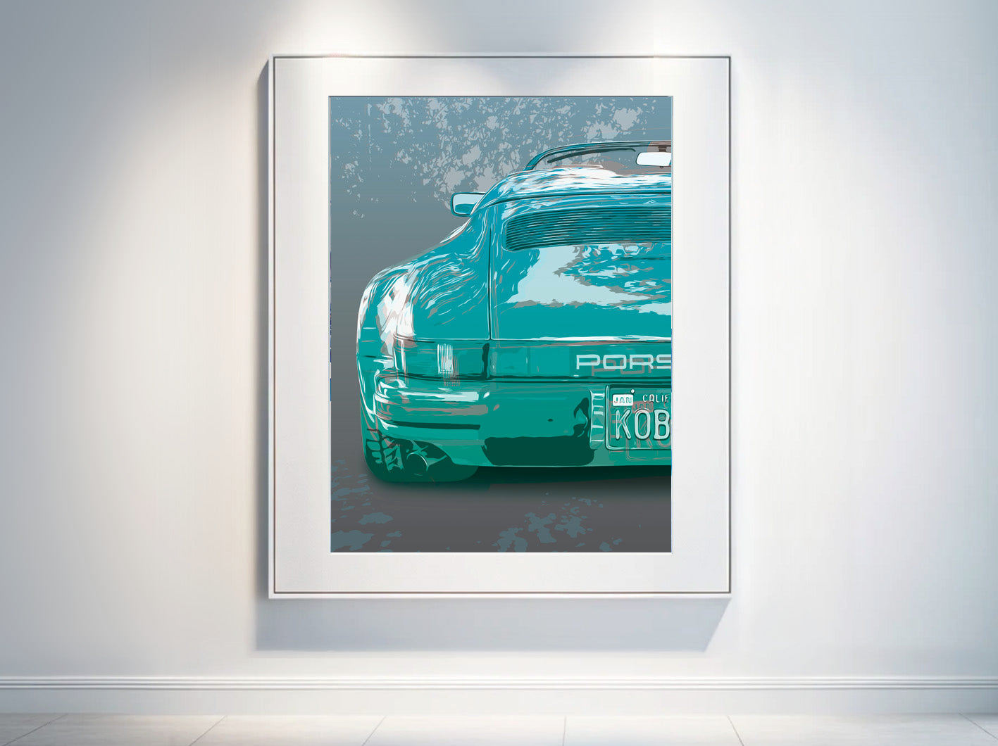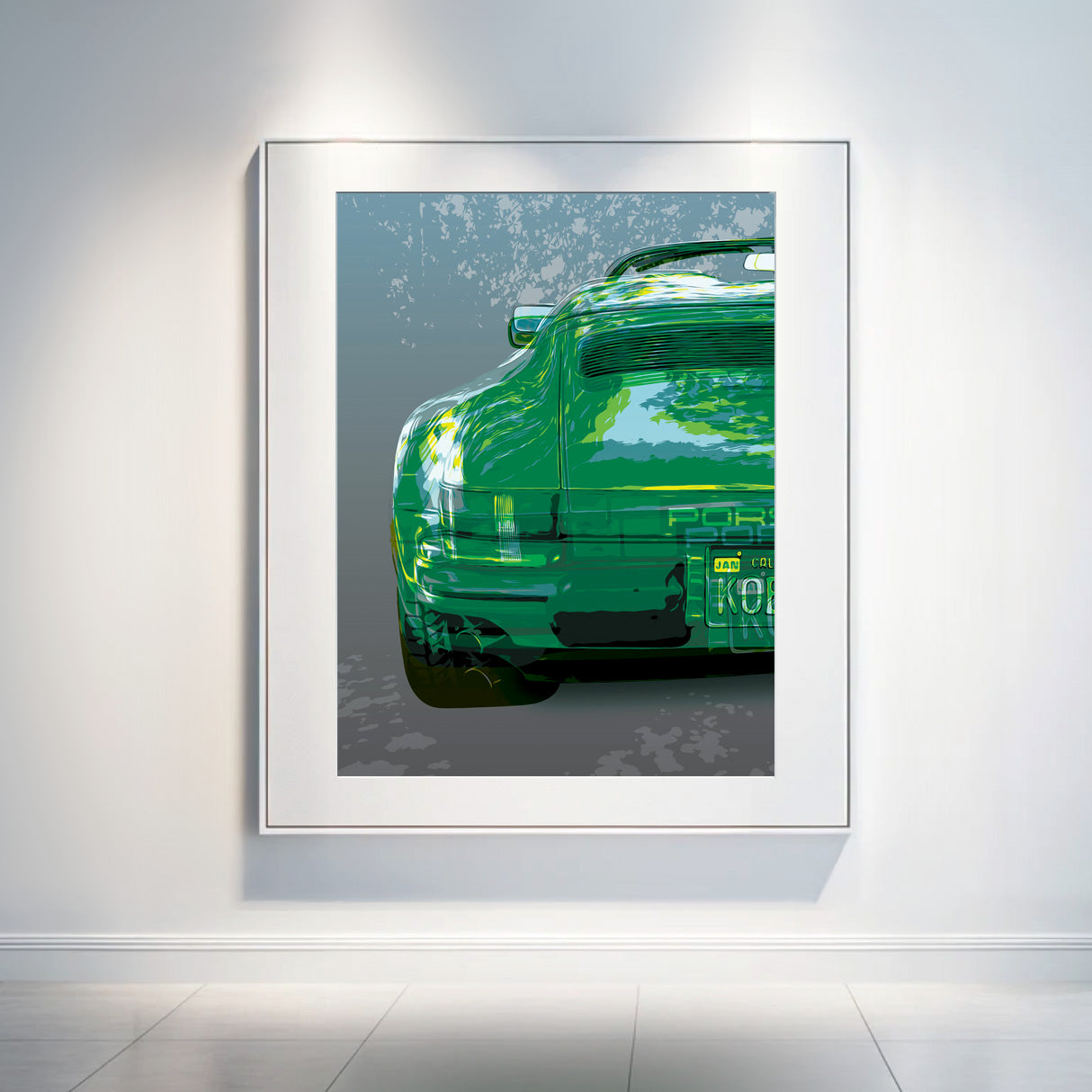 Creative artwork based on the 1989 Speedster. Made from 10 individual vector layers of paths/areas allowing for pin sharp quality print at any size. This version in British Racing Green on grey. Many other colors available, bespoke colors available upon request.